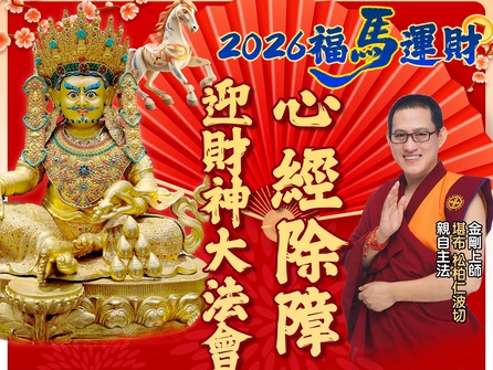 2026丙午馬年,為植福修慧、廣結善緣的驛馬年,更是法身慧命造福之年。由金剛上師【堪布 松柏仁波切】親自主法殊勝的新年大法會,迎請五姓財神與龍天護法,為您開啟新年新運新氣象!法會是公益、免費入場,歡迎有緣的你們,一起做公益種福田,發心參贊、共襄盛舉,為自己及家人在2026年注入飽滿的財氣好運!